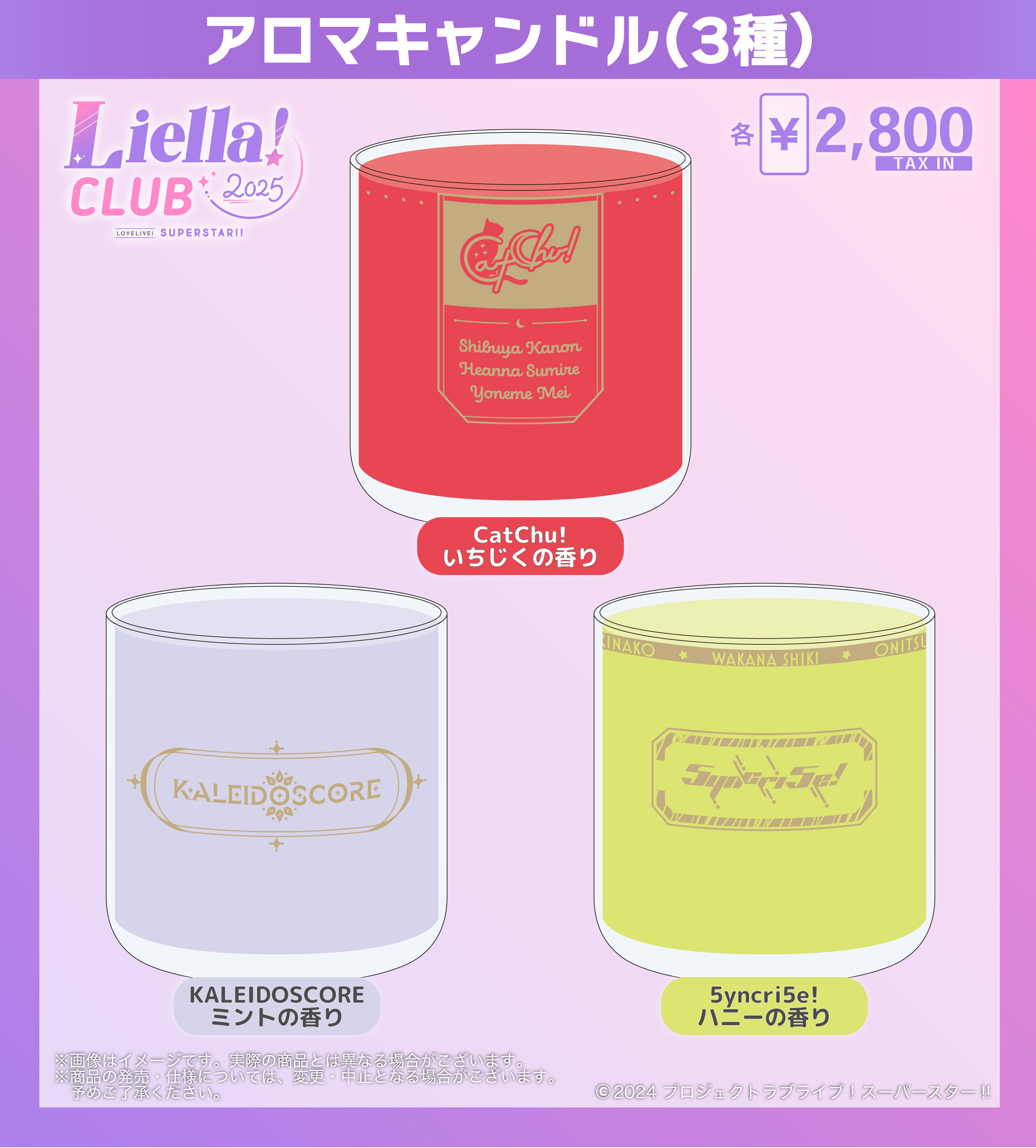 また寒い時期のリラックスタイムにぴったりな「アロマキャンドル」は、ユニットをイメージしたデザインの3種展開。各ユニットを代表して伊達、Liyuu、坂倉がアロマの香りを選定しています。その様子を収めたボイスコンテンツをLiella! CLUB内「MEMORIES」で配信しておりますので、併せてお楽しみください!